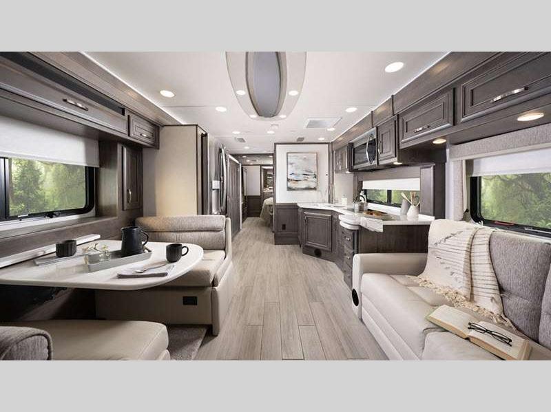 Sleeps 5 Slides 3 Length 39 ft 11 in Ext Width 8 ft 5 in Ext Height 12 ft 10 in Int Height 7 ft Interior Color Glacier, Summit, Valley Exterior Color Blue Dusk, Coral Nights, Crimson Sky, Sand Dunes Hitch Weight 10000 lbs GVWR 36320 lbs Fresh Water Capacity 100 gals Grey Water Capacity 62 gals Black Water Capacity 41 gals Tire Size 275/80R 22.5" Furnace BTU 50000 btu Generator Onan 8,000-watt diesel Fuel Type Diesel Engine Cummins B6.7 Chassis Spartan K1 Horsepower 360 hp Fuel Capacity 100 gals Wheelbase 261 in Available Beds King Power Head Lift Torque 800 ft-lb Refrigerator Type Stainless Steel Residential Convection Cooking Yes Cooktop Burners 2 Shower Size 30" x 40" Number of Awnings 1 Axle Weight Front 14320 lbs Axle Weight Rear 22000 lbs LP Tank Capacity 24.5 gals Water Heater Type Tankless AC BTU 45000 btu TV Info LR 50" Samsung 4K UHD Smart TV, BR 32" LED Smart TV, Ext. 43" Samsung 4K UHD Smart TV Awning Info Carefree Power Patio w/LED Lights Washer/Dryer Available Yes Gross Combined Weight 46320 lbs Shower Type Standard Electrical Service 50 amp Solar Wattage 400 watts Similar Floorplans