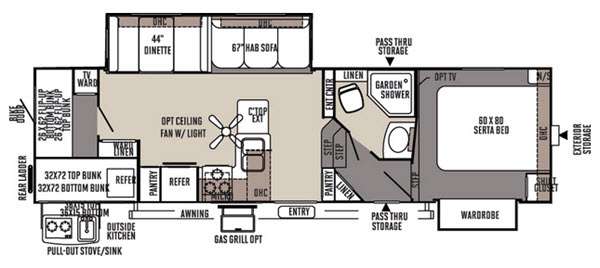 There are plenty of overhead cabinets throughout the fifth wheel as well as an exterior pass thru storage area. Outside you can enjoy the outside kitchen which offers a sink, refrigerator, and two burner range. There is even an optional grill that you can choose.